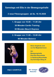 18. Oktober 2025(2 Veranstaltungen) 10:00: Neu: Cardio Training mit Bauch Express - klicke hier für weitere Infos – Ella Gutmann bietet ab Samstag den 18.10.2025 zwei neue Gruppen an. weiteres siehe flyer:
