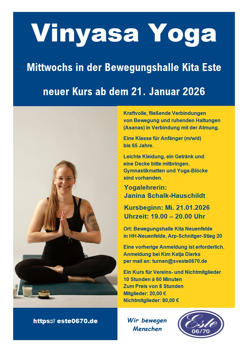 Ab Mittwoch den 21. Januar 2026 beginnt in der Bewegungshalle Kita Neuenfelde eine neue Klasse Vinyasa Yoga mit der Yogalehrerin Janina Schalk-Hauschildt.